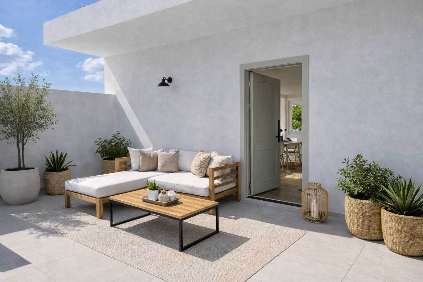 The Terrace Suite is designed to offer a calm and comfortable retreat, combining understated luxury with thoughtful details. Inside, guests will find a spacious layout featuring a king-size bed, a large private bathroom, and carefully selected amenities including a coffee machine for added convenience. Soft, neutral tones and natural materials create a relaxing atmosphere, while a private balcony with mountain views provides a peaceful spot to start or end the day. The suite also opens onto a generous terrace with beautiful sea views, seamlessly connecting indoor comfort with outdoor living.